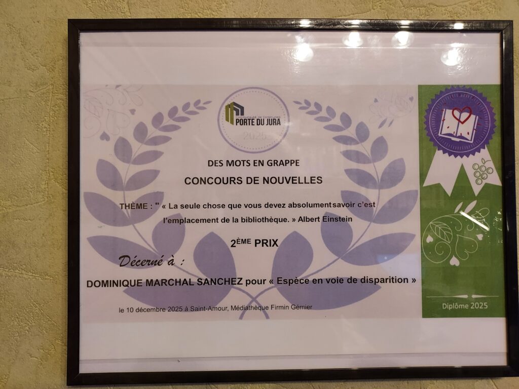 Mme MARCHAL-SANCHEZ, adhérente de l’APAC a participé à un concours de nouvelles organisé par la Médiathèque Firmin Gémier à ST. AMOUR (Jura). Cette nouvelle qui devait respecter le thème ” La seule chose que vous devez absolument savoir, c’est l’emplacement de la bibliothèque” a obtenu le 2ème prix du concours de nouvelles.